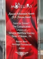April 25, 2023 - The Pennsylvania Federation of Museums and Historical Organizations bestows one of eight statewide 2023 Special Achievement Awards to the Beaver Area Heritage Museum for its exhibit, “Saint or Sinner? The Complicated Legacy of Senator Matthew Stanley Quay” and its companion video documentary. “PA Museums’ annual awards are meant to inspire the museum field and impress visitors to museums,” said Rusty Baker, executive director of PA Museums in Harrisburg. “The Beaver Area Heritage Museum is one of Pennsylvania’s star performers, and we are proud to recognize its great work along with other museums and historical organizations throughout the Commonwealth.” The Heritage Foundation was praised for tackling: